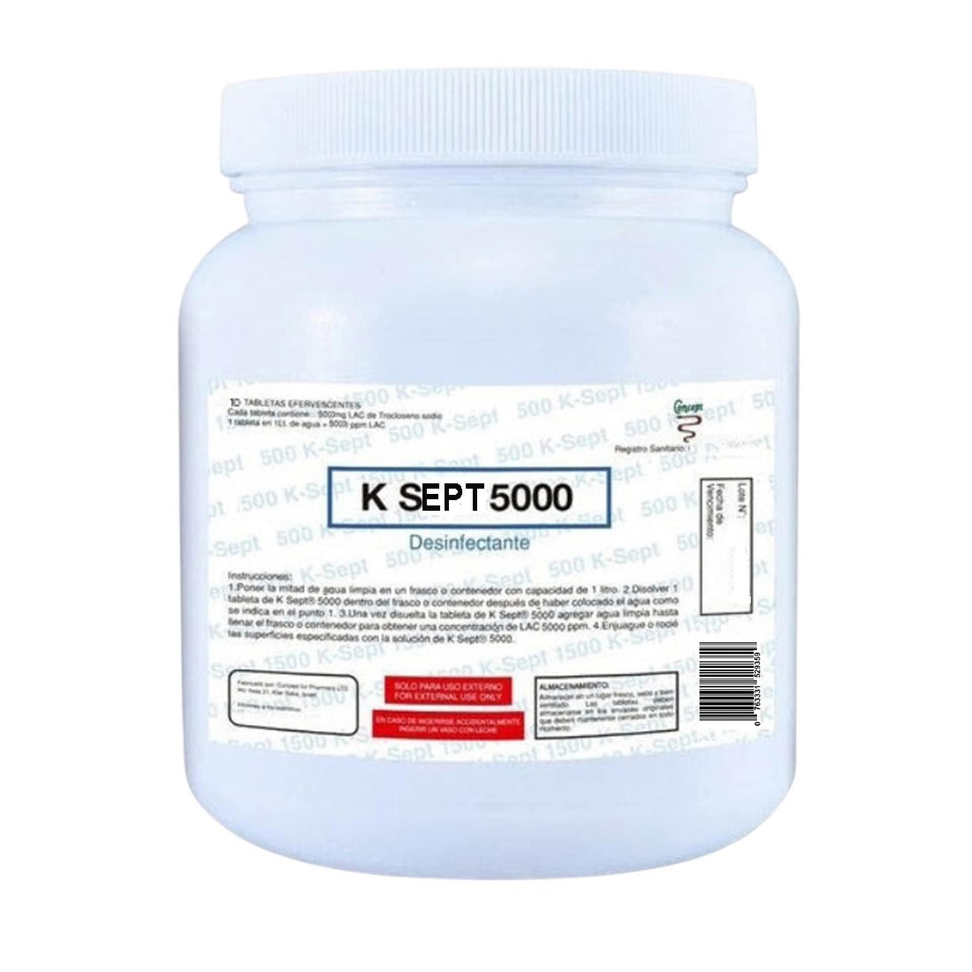 K Sept 5000 ppm Trocloseno de Sodio NaDCC bote con 10 Tabletas efervescentes