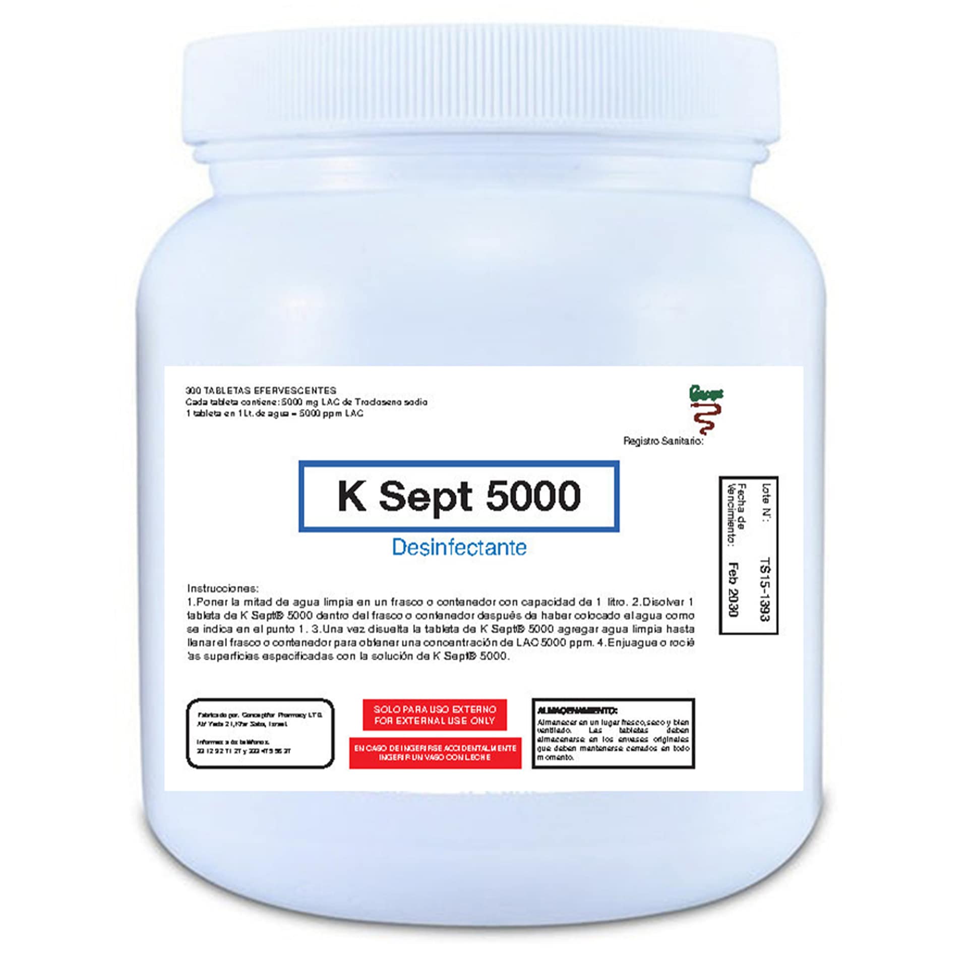 | K SEPT 5000 ppm | Tableta efervescente | 5000 mg (c/o) | 1 tableta en 1 L = 5000 ppm (LAC) | Bote PPL con 1, 5, 10, 50, 100 o 300 tabletas |