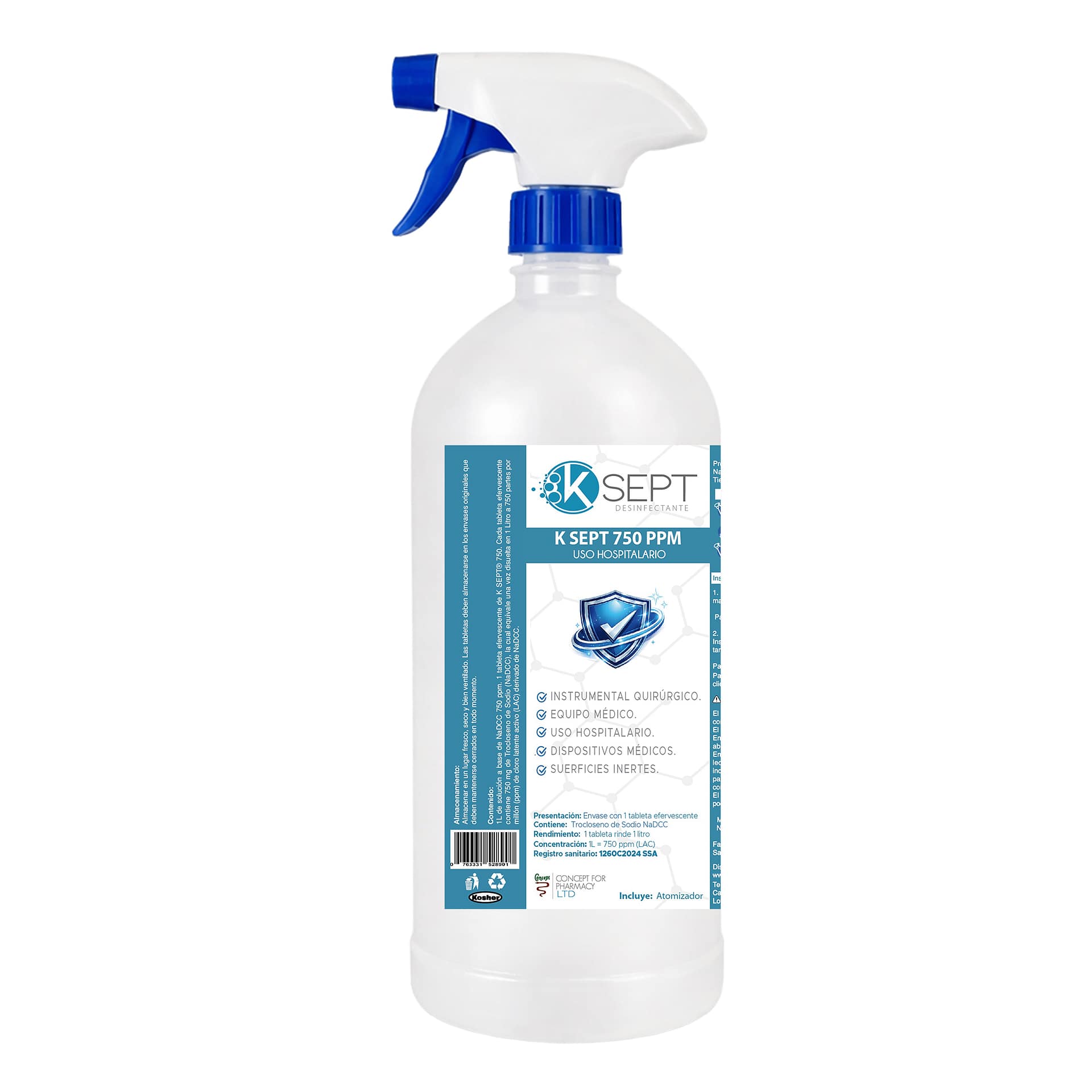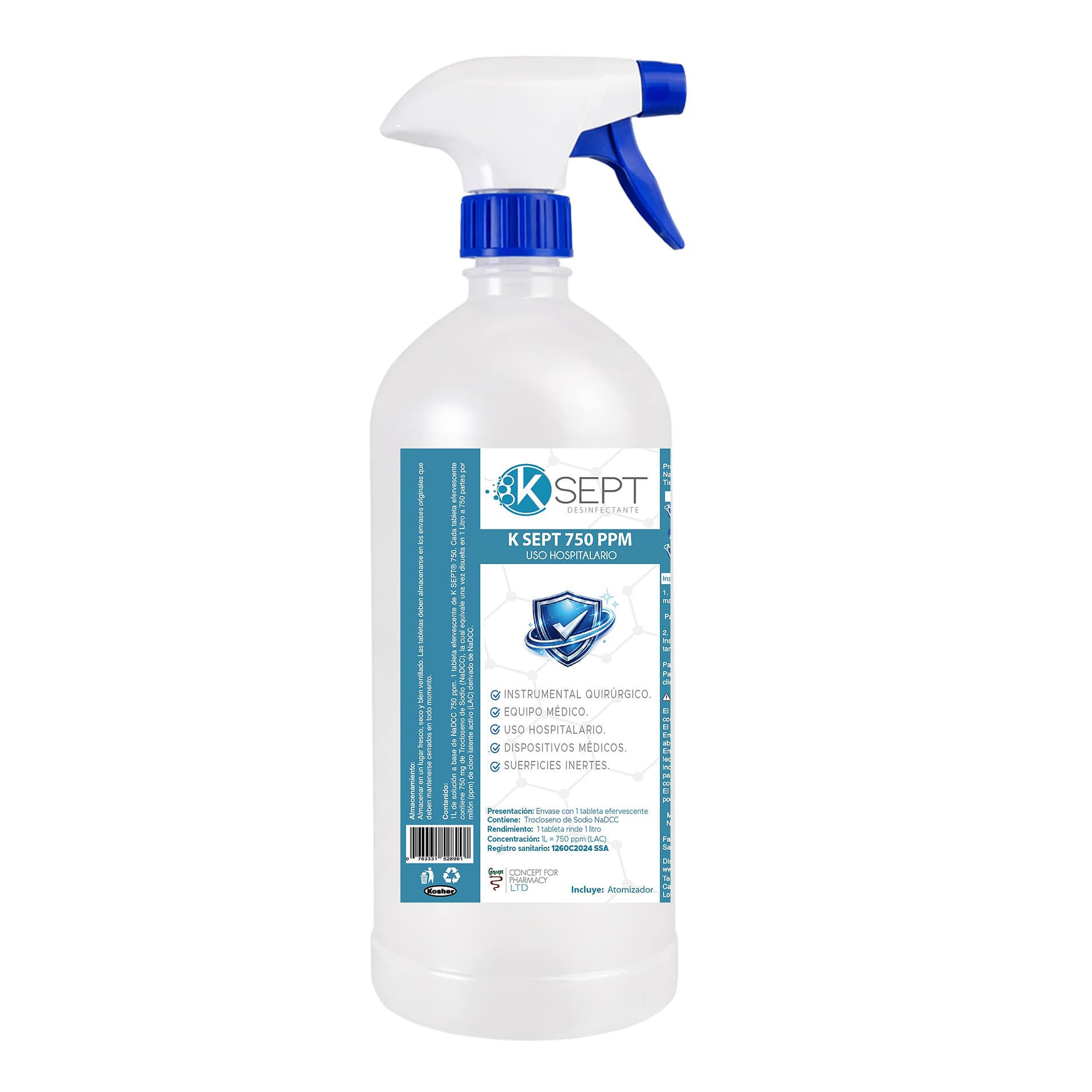 | K SEPT 750 ppm | Tableta efervescente | 750 mg (c/o) | 1 tableta en 1 L = 750 ppm (LAC) | Bote PPL con 1, 5, 10, 50, 100 o 200 tabletas |