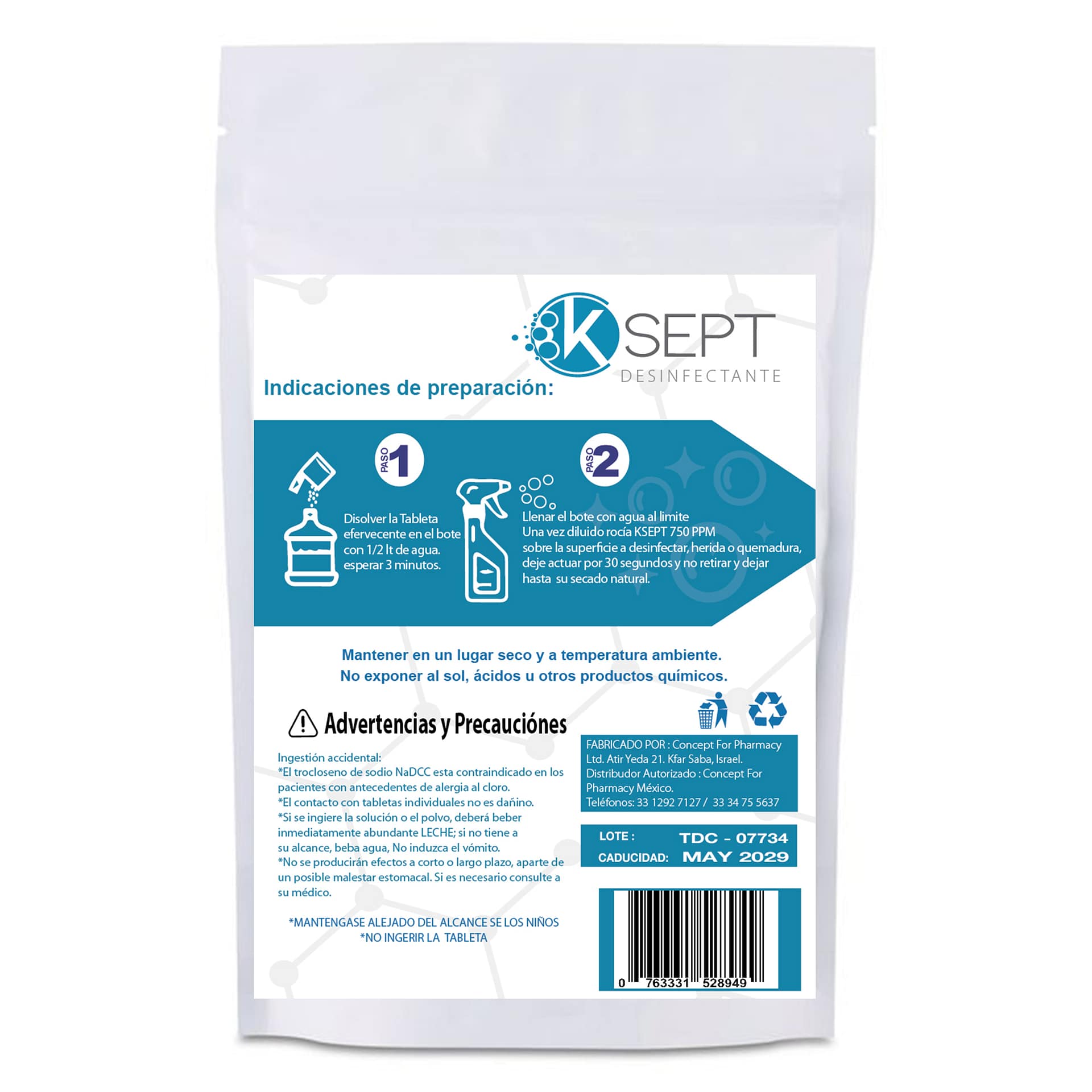 K Sept 750 ppm Trocloseno de Sodio NaDCC  sobre con 1 tableta efervescente para 1 litro